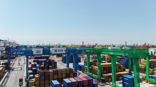 天下港口,津通世界。作为昼夜不停工的世界级人工深水大港,天津港集团在2024年创下4.93亿吨货物吞吐量、2328万标准箱的纪录。天津港已成为世界贸易枢纽,连通180多个国家和地区的500多个港口。